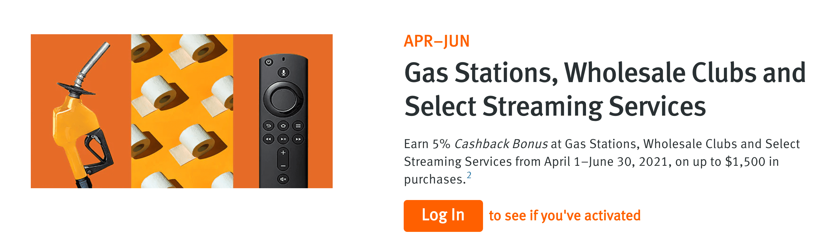 Activate to earn 5% Cashback Bonus at Gas Stations (stand-alone), Wholesale Clubs and Select Streaming Services from 4/1/21 (or the date on which you activate 5%, whichever is later) through 6/30/21, on up to $1,500 in purchases. Purchases made at Gas Stations include only merchants in the category that sell automotive gasoline that can be paid for either at the pump or inside the station. Gas Stations affiliated with supermarkets and supercenters may not be eligible. Check with your Wholesale Clubs to make sure your Discover card is accepted. Purchases of affiliated Wholesale Club services, such as delivery services, travel and cell phone purchases, may not be eligible in this category. Individual merchants and stand-alone stores within physical Wholesale club locations, or online, may not be eligible in this category. Select Streaming Services purchases include only the following select U.S. streaming subscriptions: Apple Music, Apple TV+, AT&T TV Now, BET+, CBS All Access, DAZN, Disney +, ESPN+, Fubo TV, Google Play Movies & TV, HBO Max, Hulu, Netflix, Pandora, Philo, Peacock TV, Showtime, Sirius XM, Starz, Sling, Spotify, Vudu, YouTube TV. If your subscription is bundled with another product or service, billed by a third party (such as a digital platform, a cable or satellite provider, telecommunications, internet provider or a car manufacturer), the purchase may not be eligible in this category. Add-ons associated with Select Streaming Services may not qualify for this promotion if they are not listed, billed in a bundle, separately or through a third party. Listed merchants are in no way sponsoring or affiliated with this program.