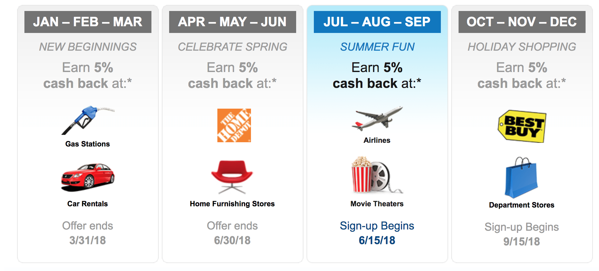 Earn 5% back on airlines and movies during the months of July, August, and September. Citi is slightly different to the other cards in that you have a $6,000 annual cap rather than a quarterly cap. So you can get 5% back on up to $6,000 in this quarter, you can save the entire amount for a different quarter, or you can use part up each quarter.
