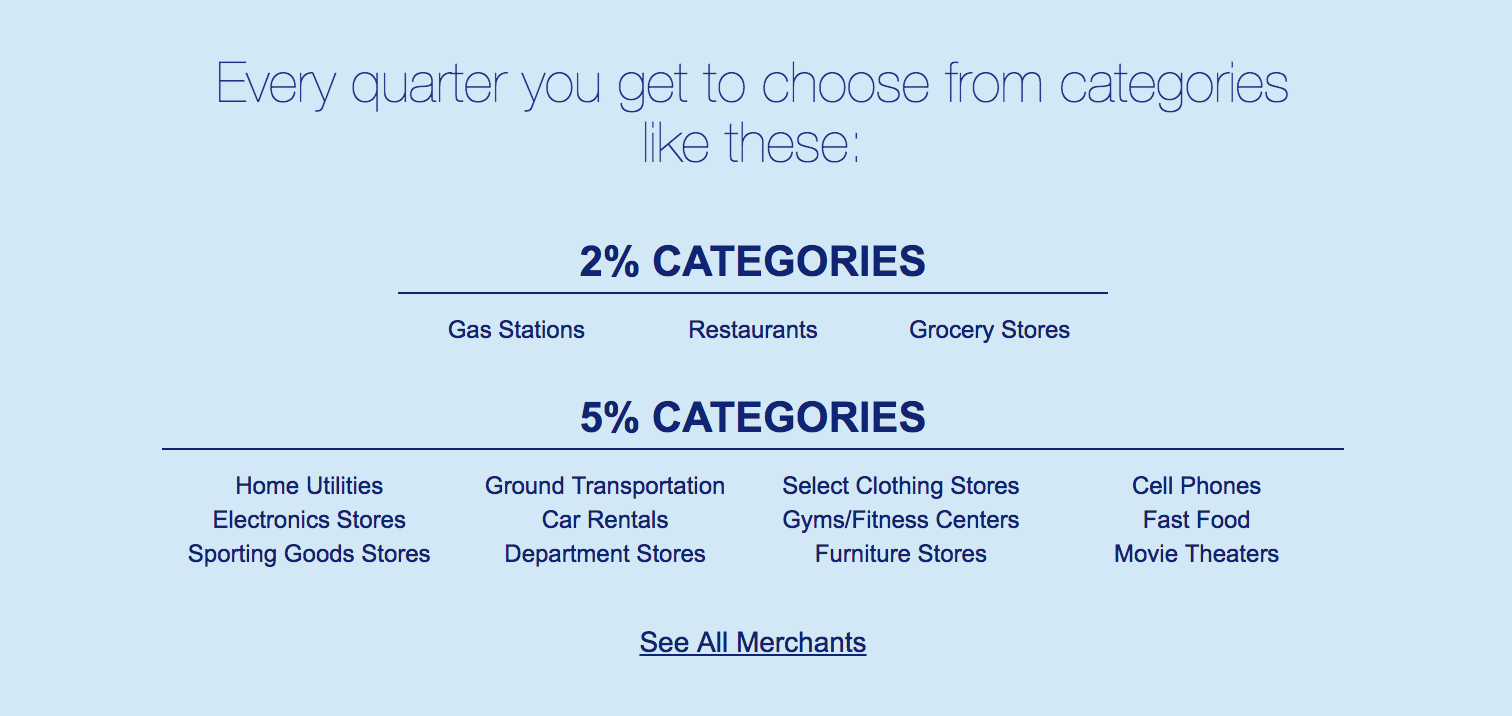 Some might find these categories useful. A lot of people will save their 5% bandwidth for the Best Buy and Department Store category during Q4 2018.
