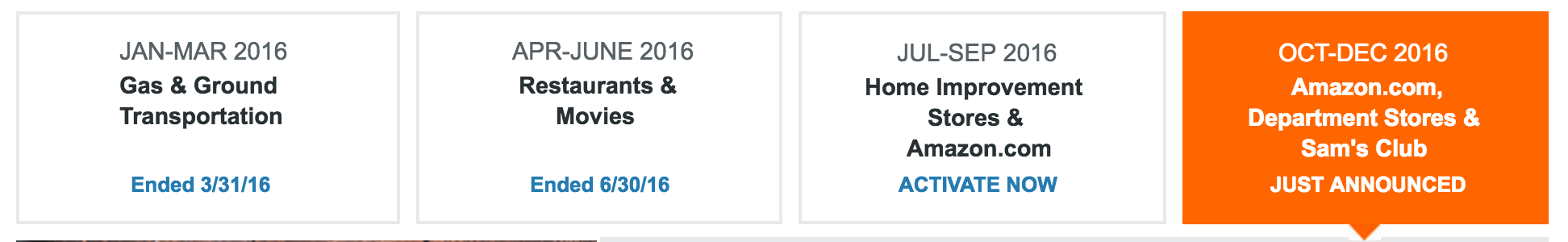 Discover announced the 5% category for the fourth quarter of 2016 (October – December) will be Amazon, Department Stores, and Sam’s Club. Sam’s will work both in-store and online.