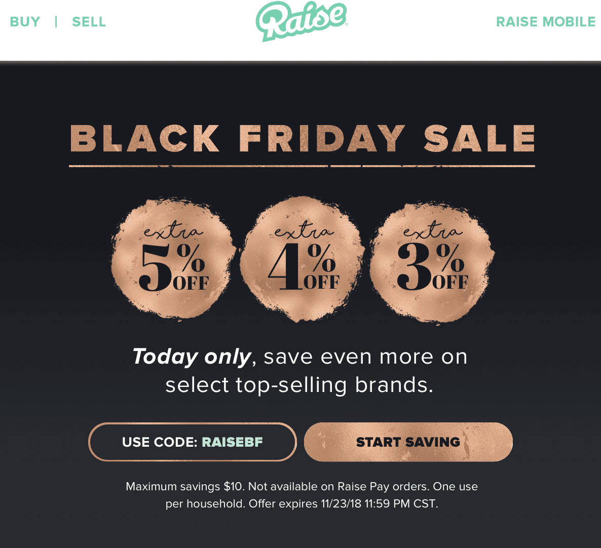 - Raise.com is offering 3% or 4% or 5% off many top brands with promo code: RAISEBF