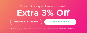 - Raise.com is offering 3% off select grocery store and takeout brands with promo code: CHECKOUT at checkout. Max discount $20.