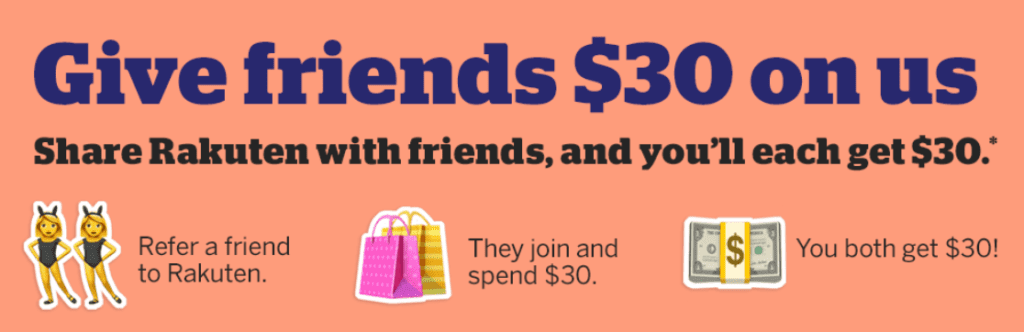 - Shopping portal Rakuten (formerly called eBates) is offering a referral bonus of $30. When you invite a friend to become a member and they spend $30 you’ll both earn a $30 bonus.