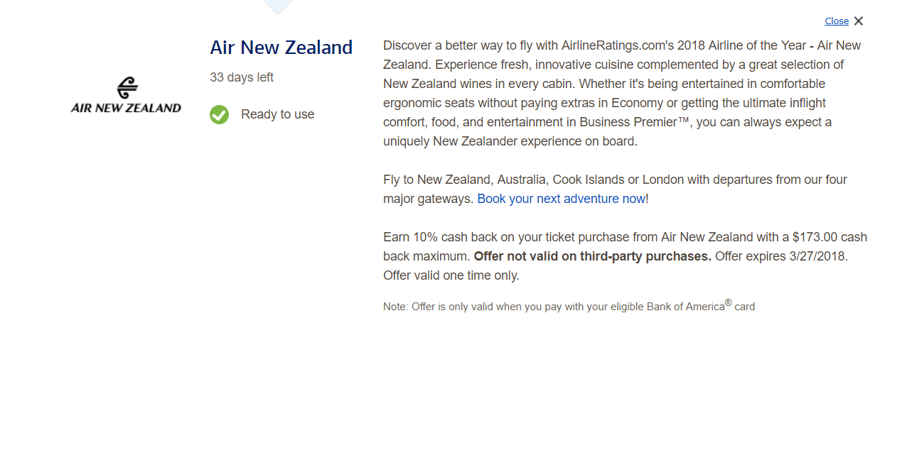 - 10% off Air New Zealand is showing up as a BofA, Regions, Suntrust offer for some.