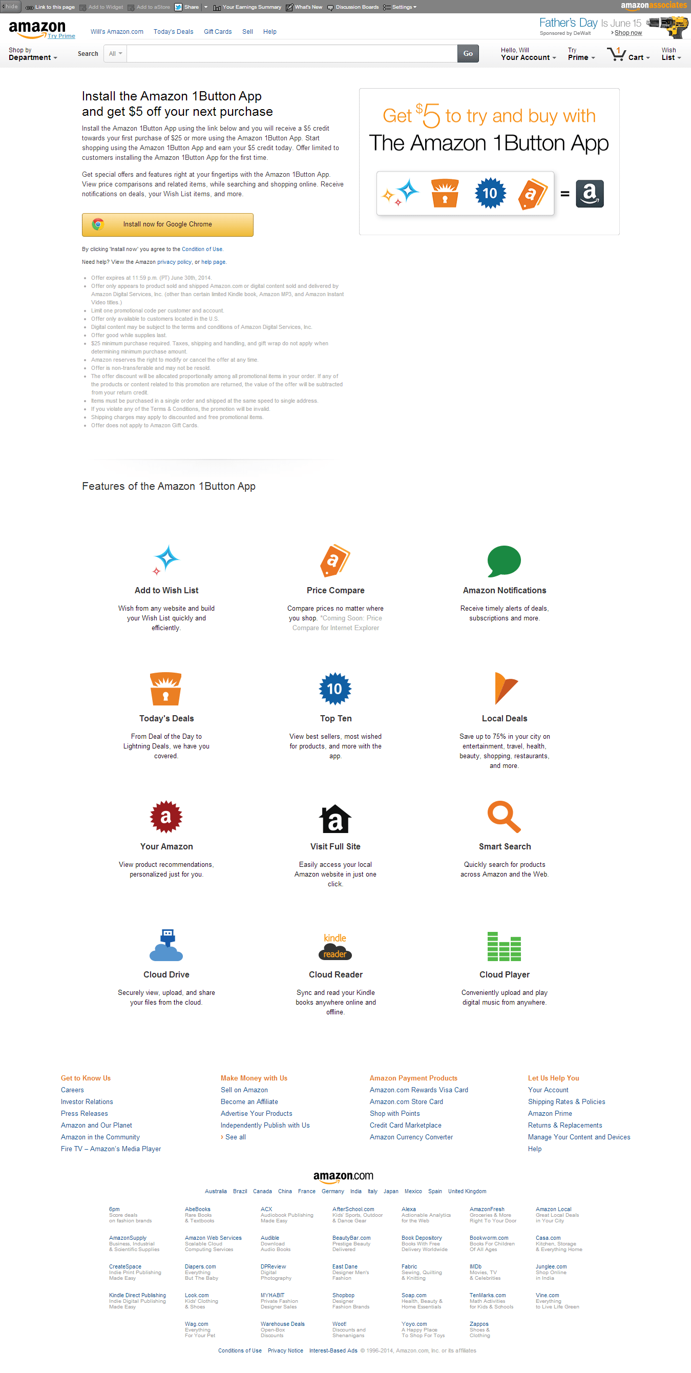 - Download & install the Amazon 1button app and you’ll receive a $5 discount on your first purchase of $25 or more that is made using the app