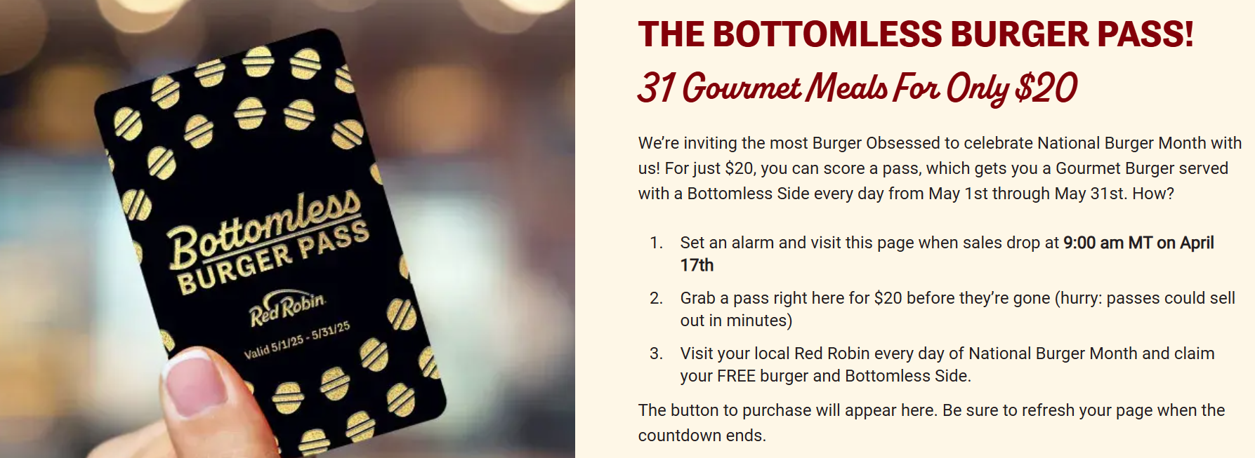 - Red Robin is offering a bottomless burger pass for $20. Goes on sale at 9AM MT April 17th. This provides one free burger and a bottomless side per day.