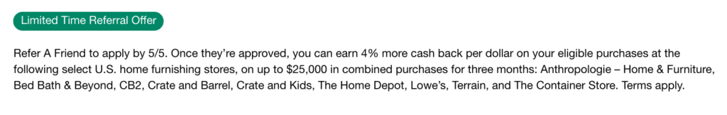 - Refer A Friend to apply for a new American Express card by May 5th; once they’re approved, you can earn 4x/4% extra bonus per dollar on your eligible purchases at select U.S. home furnishing stores, on up to $25,000 in combined purchases for three months.