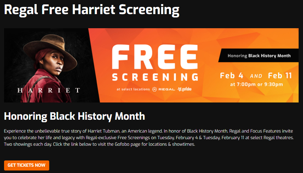 - Selected Regal Cinemas are offering a free screening of Harriet on February 4th & February 11th. Session times are 7PM or 9:30PM