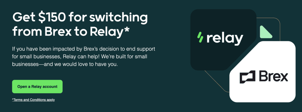 Relay Financial, a platform for small business banking and cash management, is offering the following signup bonus for small businesses who were affected by the recent Brex decision to stop services to small businesses: