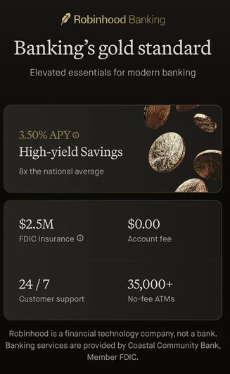 Seems that customers with $100,000 in assets with Robinhood will also get free ATMs and free wire transfers. During the earnings call banking was mentioned and it seemed like Robinhood would be pushing it this year and potentially offering 3.5% APY on the checking account as well. Vladimir Tenev (CEO):