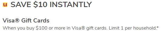 - $10 off instantly when you buy $100 or more in Visa gift cards.