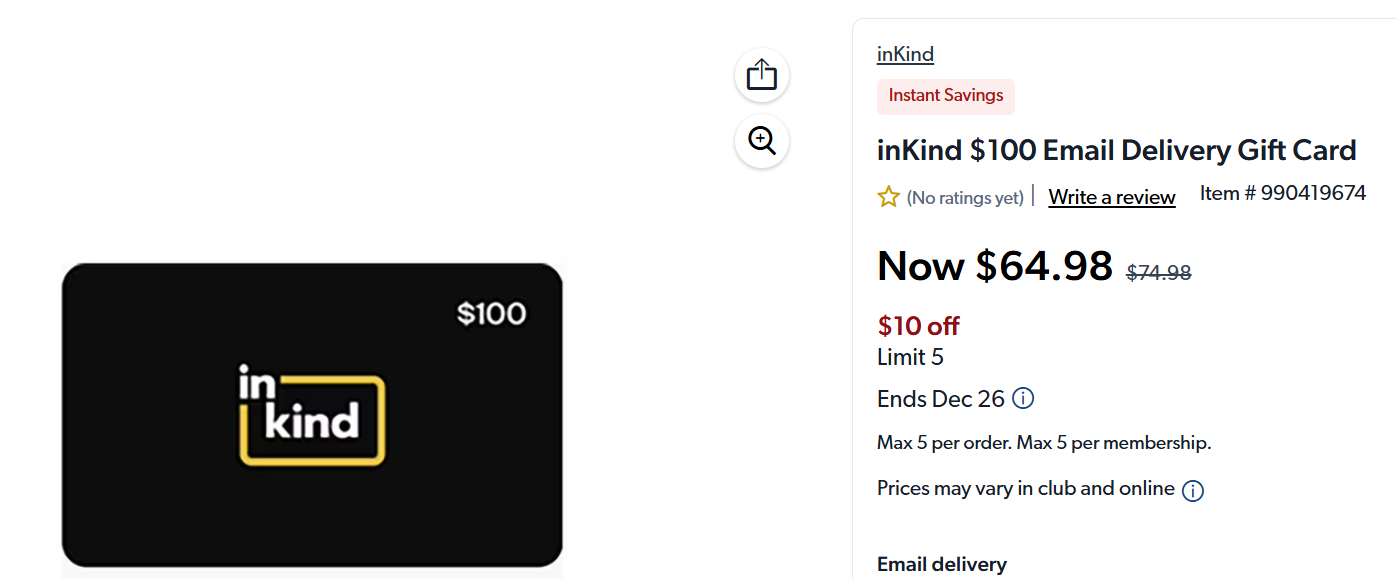 - Samsclub.com is offering a $100 inKind giftcard for $64.99. Limit 5. Valid until December 26