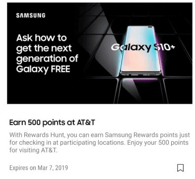 - Samsung Pay is offering 500 rewards points via Rewards Hunt when you visit an AT&T store. Follow these instructions: