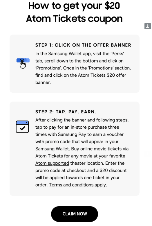 Samsung Wallet: Save $20 On Movie Tickets April 3, 202511 Commentsby William Charles Contents1 The Offer2 Our Verdict The Offer Samsung Wallet is offering a $20 Atom Tickets coupon. Our Verdict First 2.5k people so be quick. Hat tip to DDG