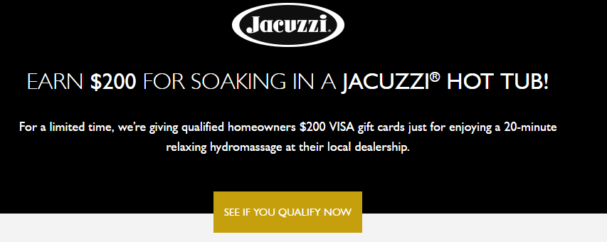 - Jacuzzi are offering a $200 Visa gift card to qualified homeowners when they schedule a 20 minute soak trial, complete that soak & fully complete a survey. All decision makers for the home must be present for the soak.