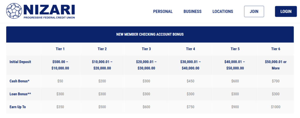 - Nizari Progressive Federal Credit Union is offering a bonus of $50-$700. Requires a direct deposit of $2,500. Tiers are based on your initial deposit