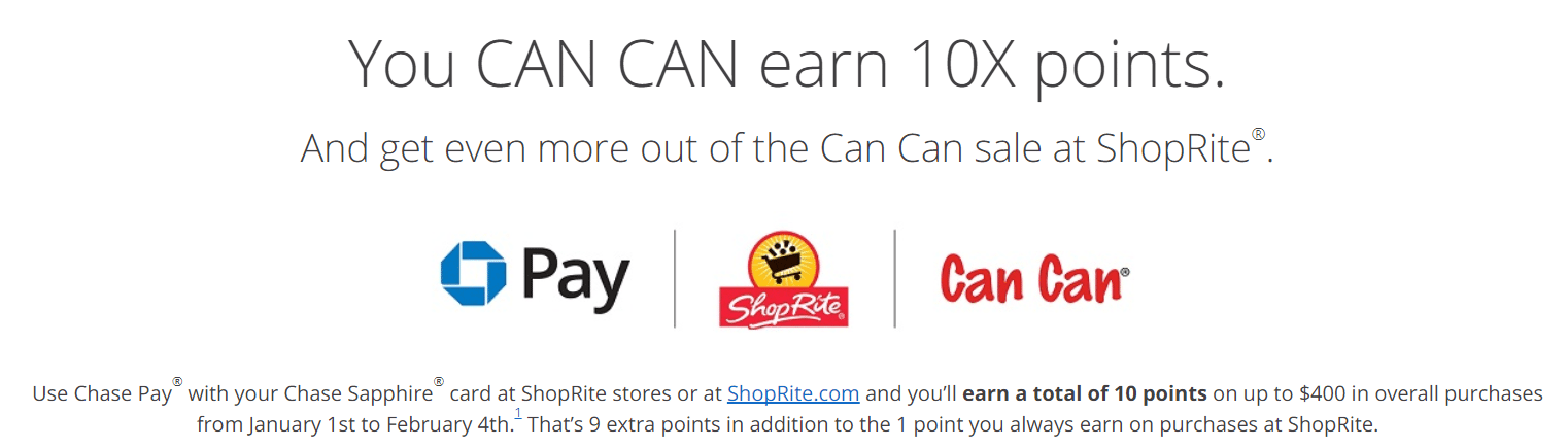 - Chase is offering 10x Ultimate Rewards points for Shoprite and shoprite.com purchase of up to $400 when using your Freedom, Freedom Unlimited, or any Sapphire version card