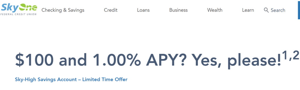 - SkyOne is offering a bonus of $100 when you open a new Sky-High Savings account and complete the following requirements: