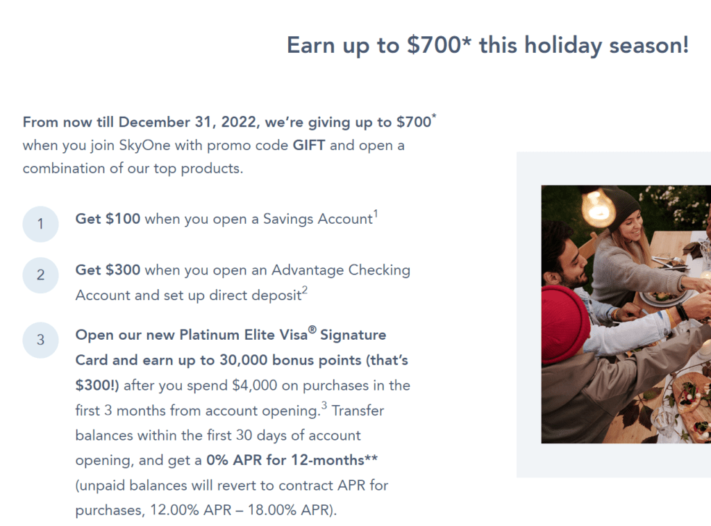 - Get $200: Open a new SkyOne Advantage checking account online from December 9, 2022, to December 31, 2022, using promo code GIFT. within 30 days of account opening establish direct deposit and receive a total of $1,000 or more in qualifying direct deposits per statement cycle for six consecutive cycles into your new checking account during the qualification period. A qualifying direct deposit is a direct deposit of your salary, pension, Social Security, or other regular monthly income, electronically deposited through the Automated Clearing House (ACH) network to this checking account. Transfers from one account to another, mobile deposits, or deposits made at a banking location or ATM do not qualify. Advantage Checking earns dividends of .05% APY if the balance requirement is met. APY=Annual Percentage Yield. Rates are effective as of the last dividend and declaration date. The rate is variable and may change after the account is opened. A $2,500 balance is required to earn dividends. Dividends are posted and compounded monthly. Fees may reduce earnings. Please refer to the Fee Schedule and All in One Disclosure for complete details. All account terms and conditions apply. This offer is intended for new checking accounts only. Offer is not available to existing SkyOne checking account holders or those whose accounts have been closed within the last 12 months.