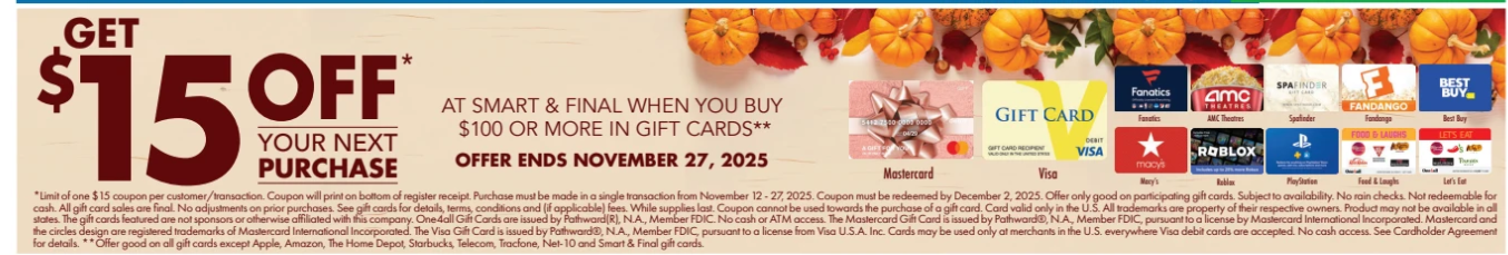 - Smart & Final stores are offering a $20 shopping credit when you buy $100 in any gift cards (excluding Apple, Amazon, The Home Depot Starbucks, Telecom, Tracfone, Net-10 and Smart & Final gift cards).