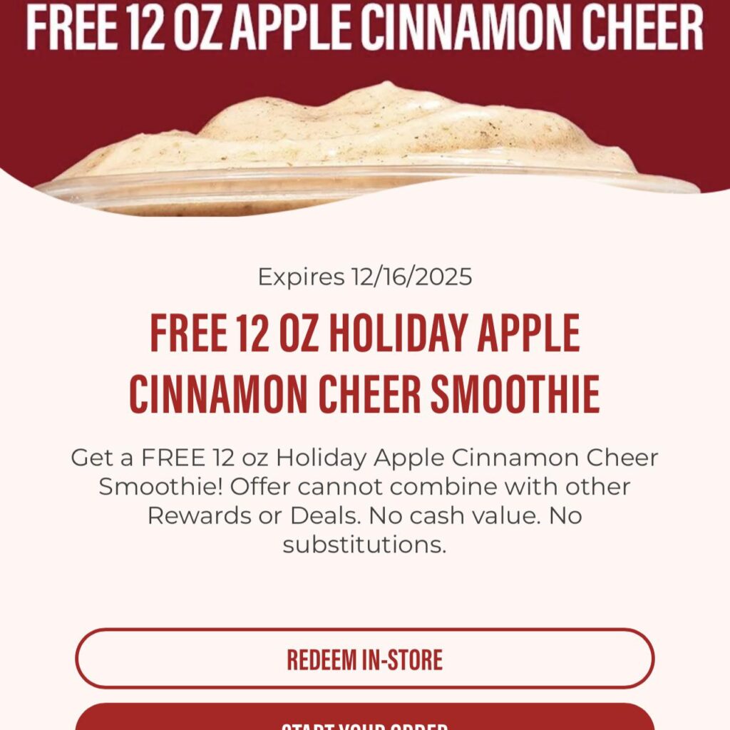 - Smoothie King is offering a free 12 oz Apple Cinnamon Cheer.