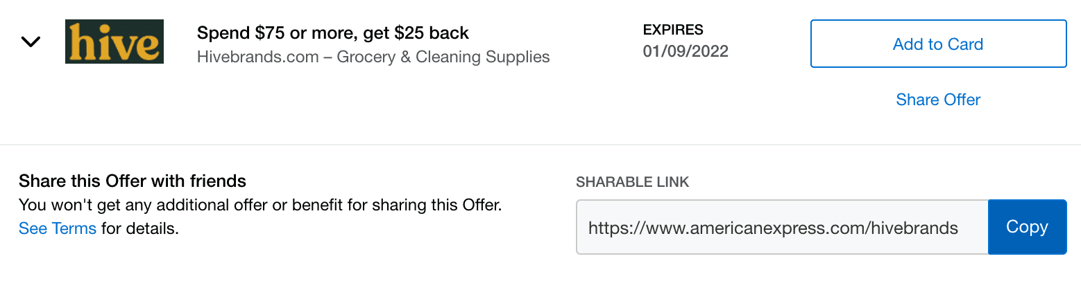 Some American Express AmEx Offers now come with a shareable link to show the offer to friends who can them save it by logging into their AmEx online account. Most offers currently don’t have the ‘sharing’ option; hopefully that’ll expand over time.