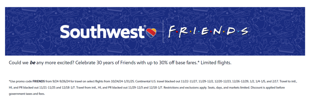 - Southwest is offering 30% off cash or points booking when you use promo code FRIENDS