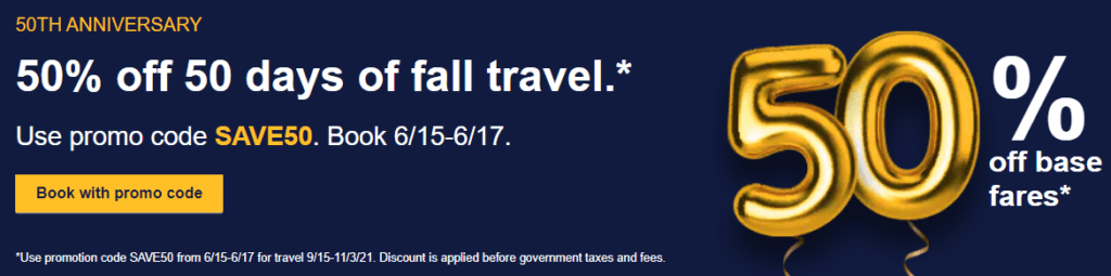 - Southwest is offering 50% off flights to celebrate its 50th Anniversary. Use promo code SAVE50