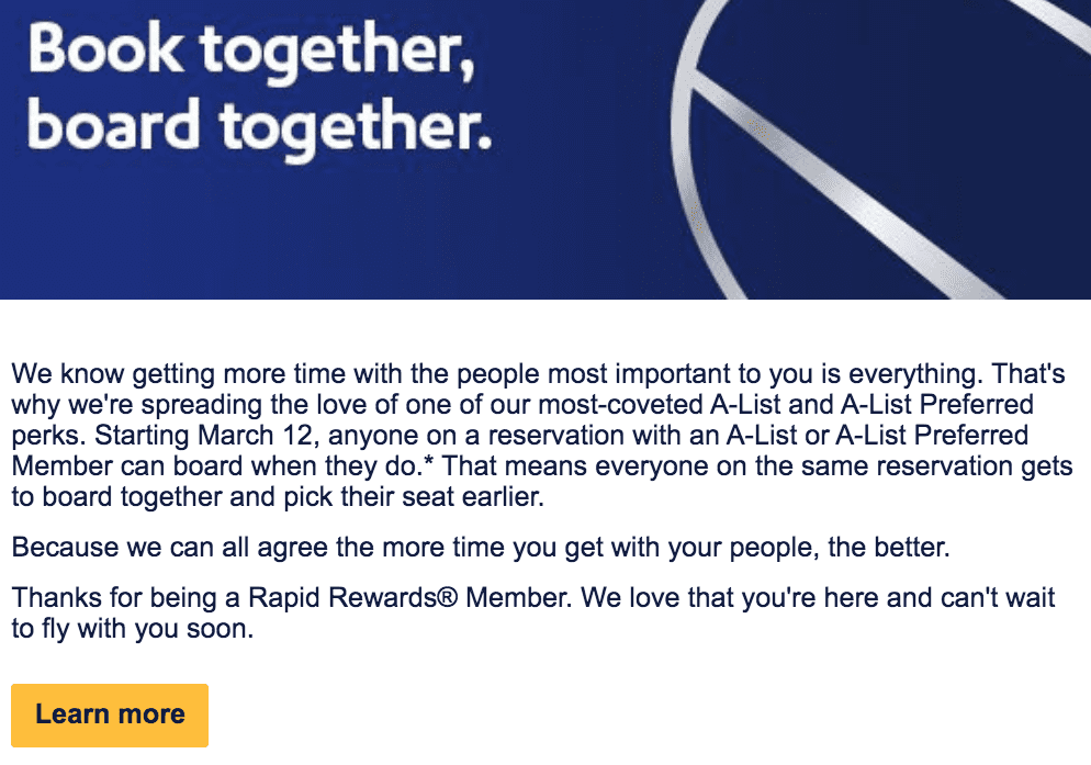 Southwest Airlines has announced a new benefit for members with A-List & A-List Preferred elite members, starting today anyone on a reservation with one of these members can board when they do.