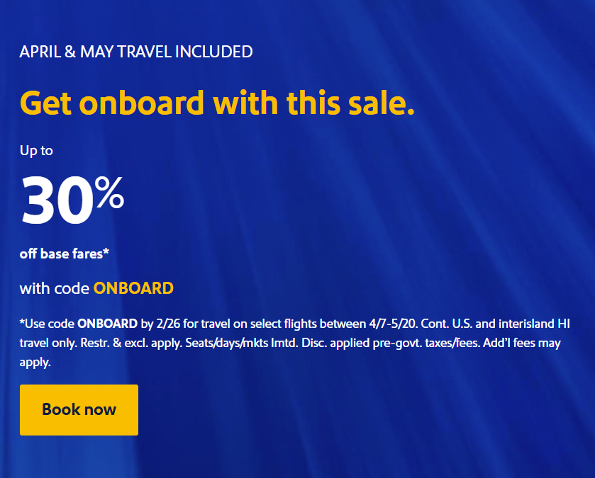 - Southwest is offering 30% off base fares with promo code ONBOARD