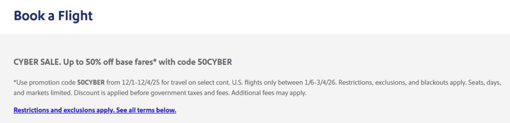 - Southwest is offering up to 50% off base fares with promo code 50CYBER