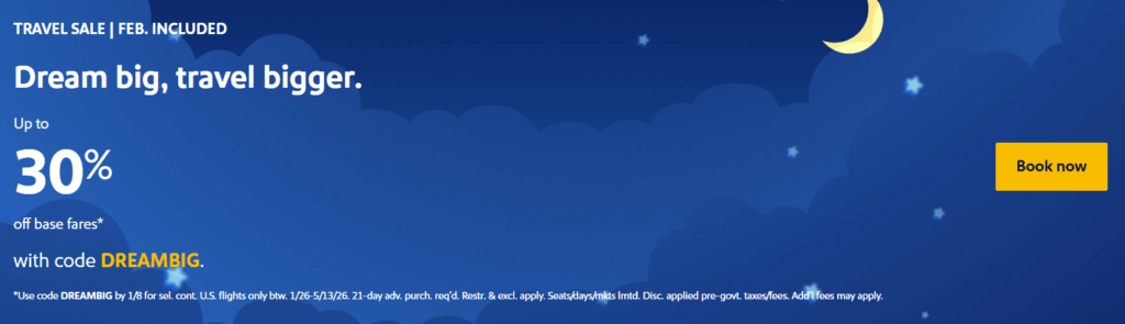 - Southwest is offering 30% off base fares with promo code DREAMBIG