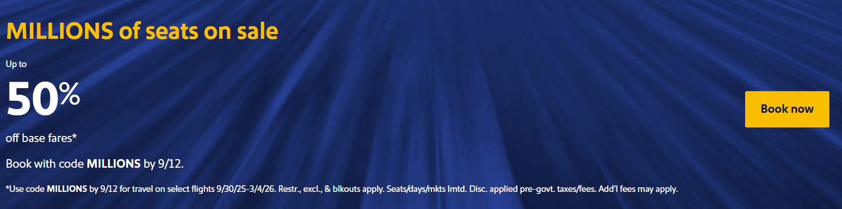 - Southwest is offering up to 50% off base fares with promo code MILLIONS
