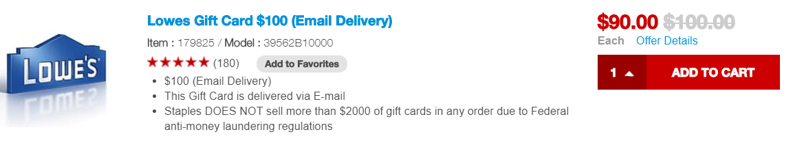 - Staples is selling a $100 Lowe’s eGiftcard for $90