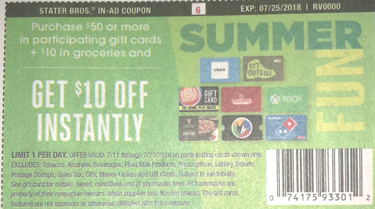 - Stater Bros is offering a $10 instant discount when you purchase $50 in eligible gift cards and $10 in groceries. Gift cards are below: