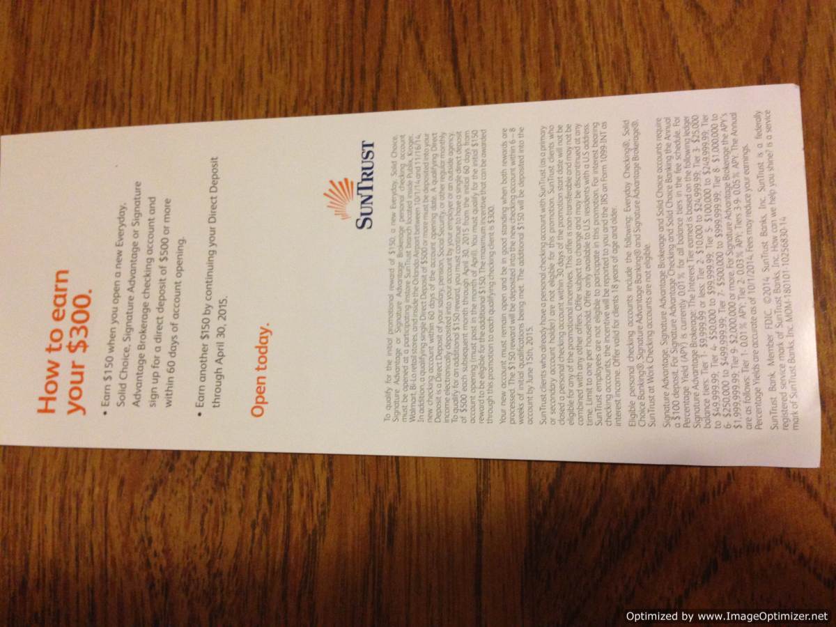- Receive a $150 bonus when you open an eligible checking account with SunTrust and establish an eligible direct deposit of over $500 within the first 60 days of account opening