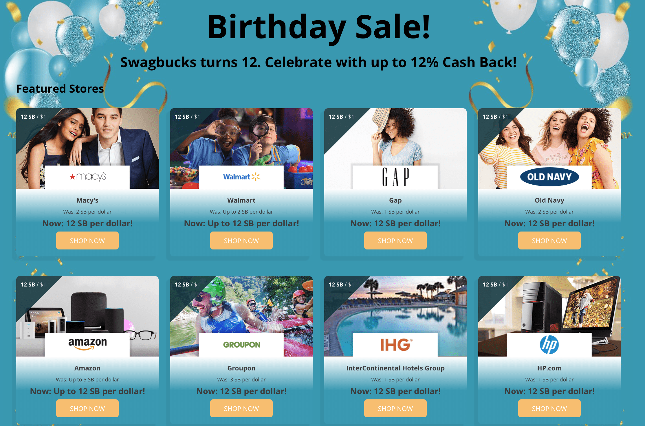 - Swagbucks is celebrating their 12th birthday by offering 12x back at dozens of stores when you shop through their portal.