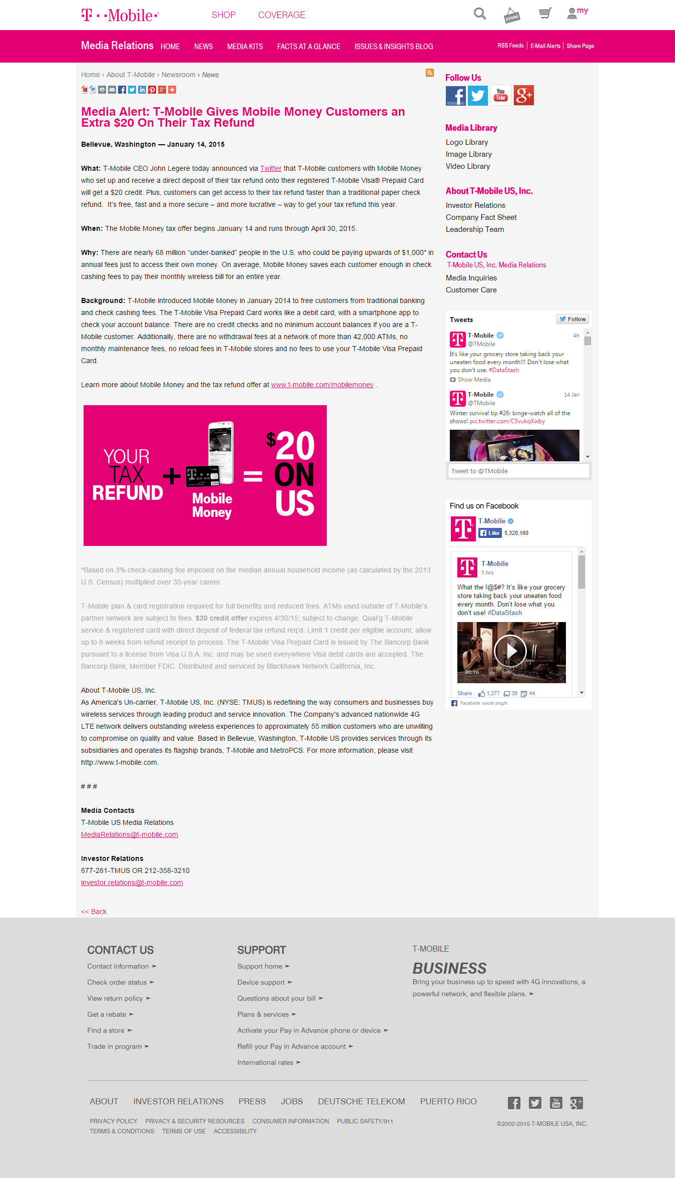 - Receive a $20 credit bonus if you receive a direct deposit of your tax refund into a registered T-Mobile Visa Prepaid Card