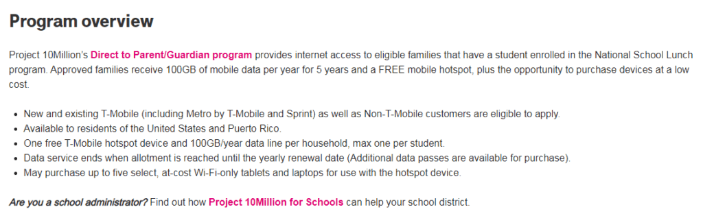 - T-Mobile has launched ‘Project 10Million’ that aims to provide internet access to eligible families that have a student enrolled in the National School Lunch program. If approved eligible families receive 100GB of mobile data a year for free for five years and a free mobile hot spot (plus you can purchase devices at a ‘low cost’).
