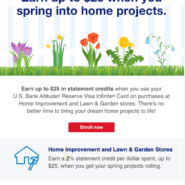 Enroll your U.S. Bank or Fidelity credit card to earn a 2% statement credit on purchases at Home Improvement and Lawn & Garden stores through April 30, 2021. Max $25 Read More →