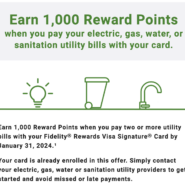 Check email for the following offer on the Fidelity credit card: Earn 1,000 Reward Points when you pay two or more utility bills with your Fidelity Visa card. Others got 1,500 Read More →