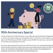 Residents of Washington state: in honor of Express Credit Union's 90th Anniversary, they are offering a special Certificate of Deposit rate. From February 9 through December 9, on the 9th of each month when you open a new CD you'll get... Read More →