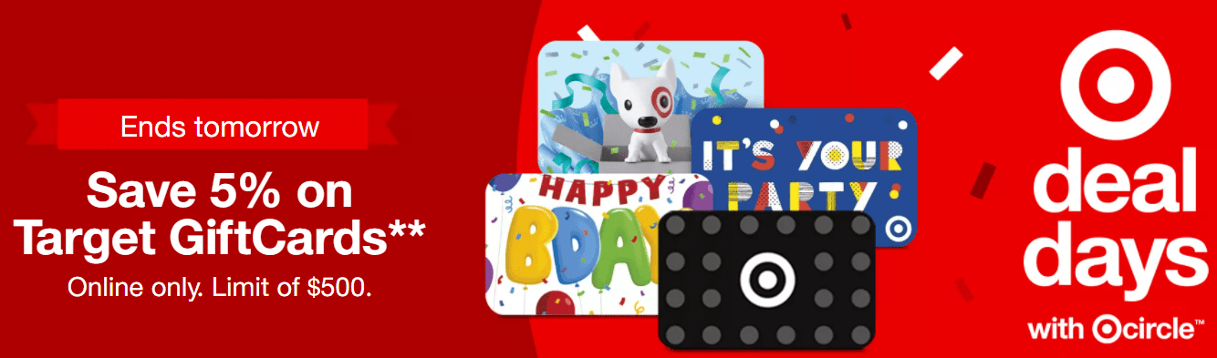 - Target.com is offering a 5% discount on Target gift cards. Limit of $25 discount ($500 in Giftcards)