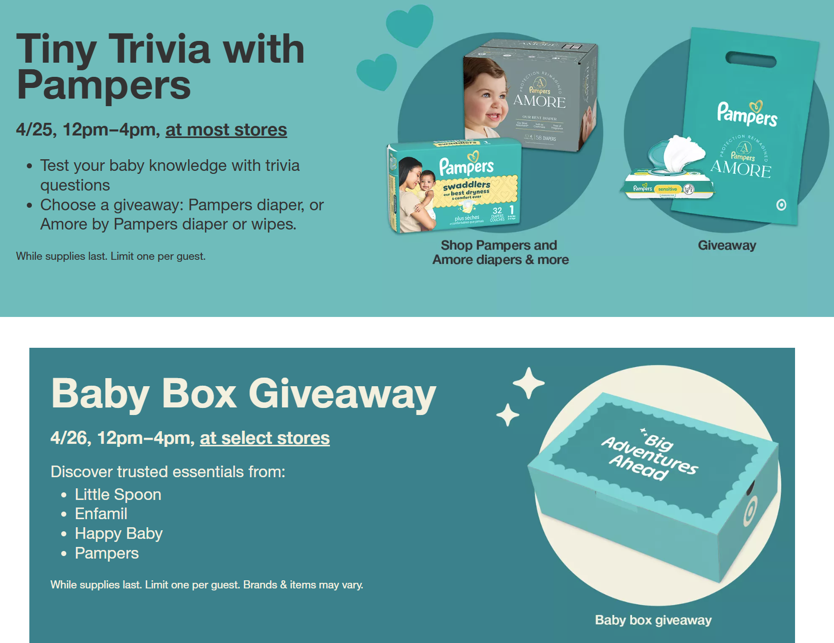 Hard to tell how good either freebie will be, it says Pampers diaper rather than Pampers diapers so if it’s a single diaper it will be a huge waste of time. I also doubt it would be a full box, so you might get a few? Anybody been to a event like this before let us know what you got in the comments. If you don’t need these but will be going to a Target during this time and line not long you can always pick them up and donate them as they are always in high demand.