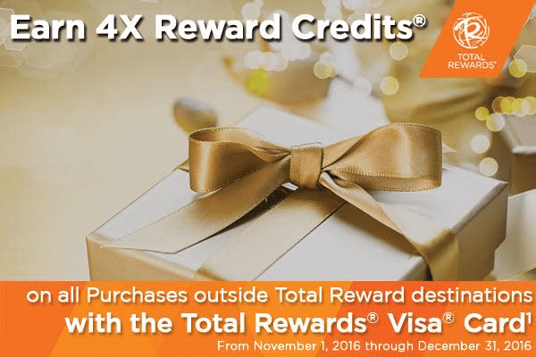 - Earn 4x Total Rewards Credits per $1 spent on all purchases outside Total Reward destinations from November 1st, through December 31st, 2016.