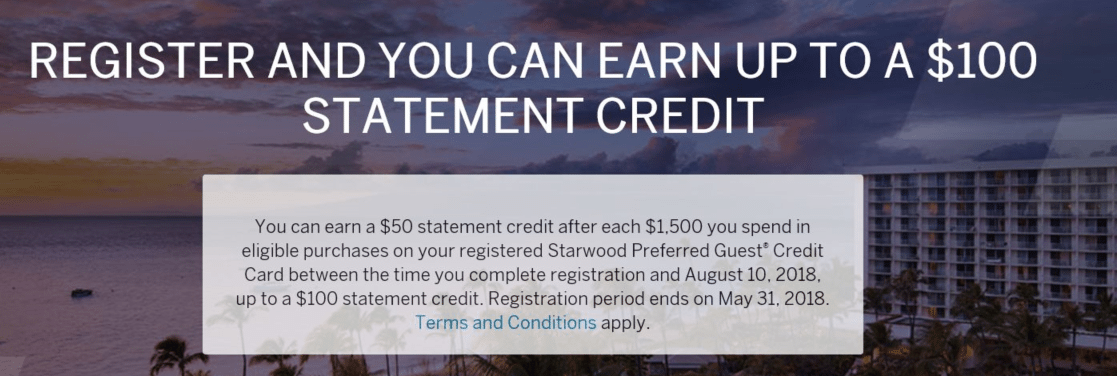 - American Express is offering some SPG personal cardholders spending bonuses. Register by May 30th and earn a $50 statement credit after each $1,500 you spend in eligible purchases on your card through August 10th, 2018. Up to $100