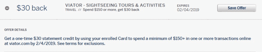 - Get a one time $30 statement credit by using your enrolled card to spend a minimum of $150+ in one or more transactions online at viator.com by 2/4/2019