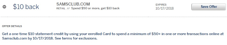 - Get a one-time $10 statement credit by using your enrolled Card to spend a minimum of $50+ in one or more transactions online at samsclub.com by 10/17/2018