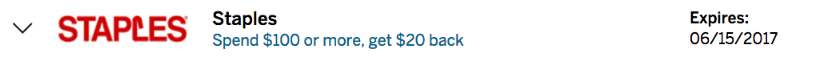 - Get a one-time $20 statement credit by using your enrolled Card to spend a minimum of $100+ in one or more transactions in-store at Staples or online at www.staples.com by 6/15/2017