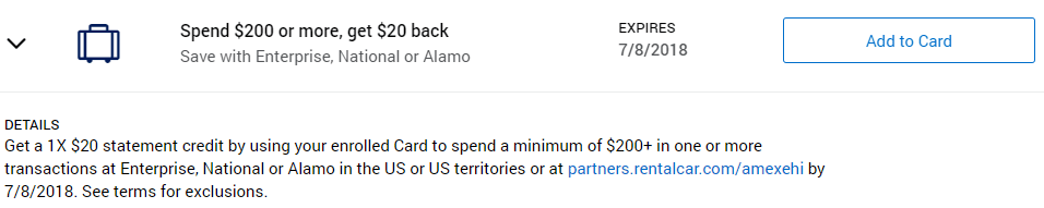 - Get a 1X $20 statement credit by using your enrolled Card to spend a minimum of $200+ in one or more transactions at Enterprise, National or Alamo in the US or US territories or at partners.rentalcar.com/amexehi by 7/8/2018
